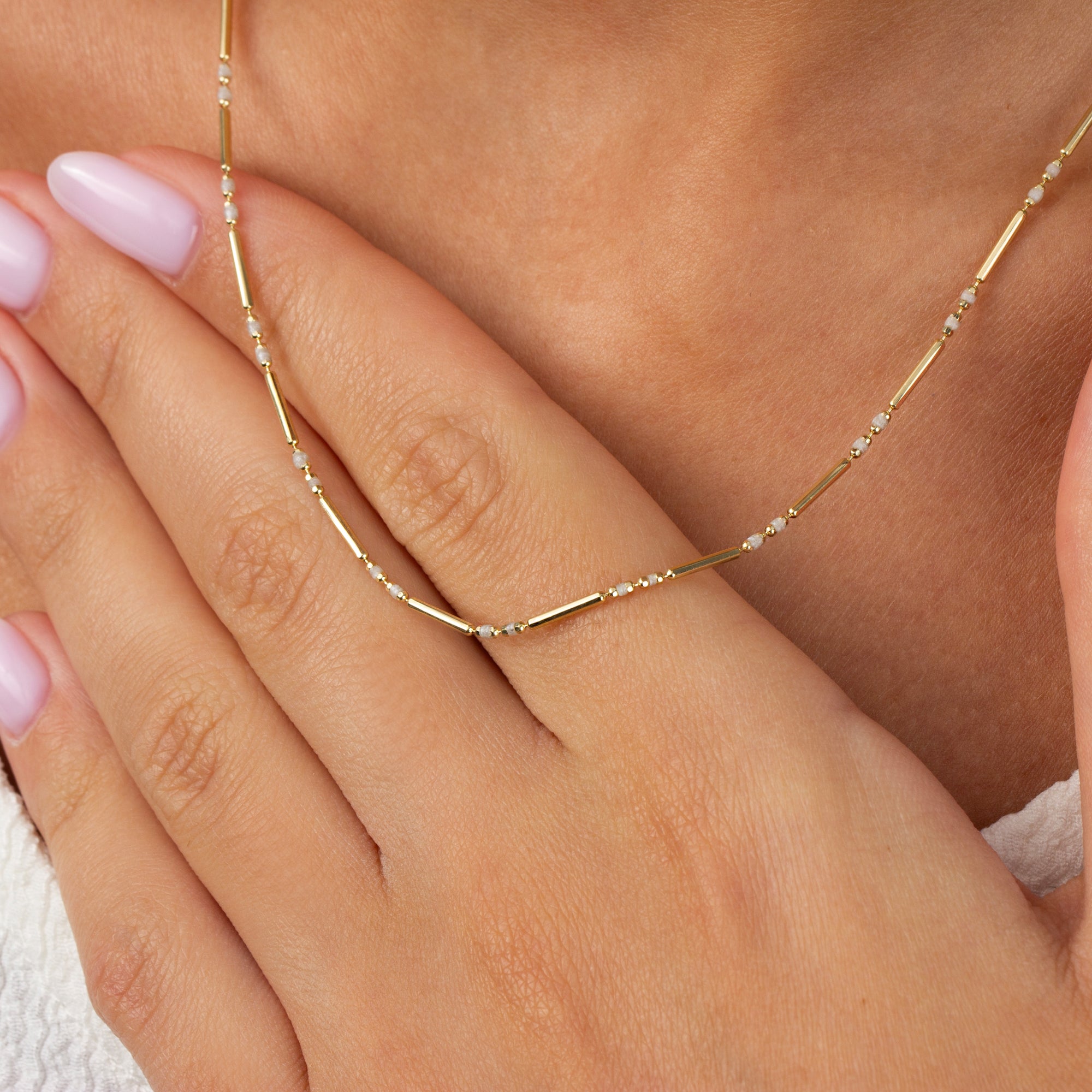 This stunning necklace is versatile enough to wear alone for a minimalist look or layered with other favorite pieces. Each bead is carefully spaced along the bar, creating a unique and eye-catching design that embodies both sophistication and playfulness. This piece is not just jewelry; it’s a statement that carries meaning and intention, whether you’re treating yourself or searching for a thoughtful gift for a loved one.