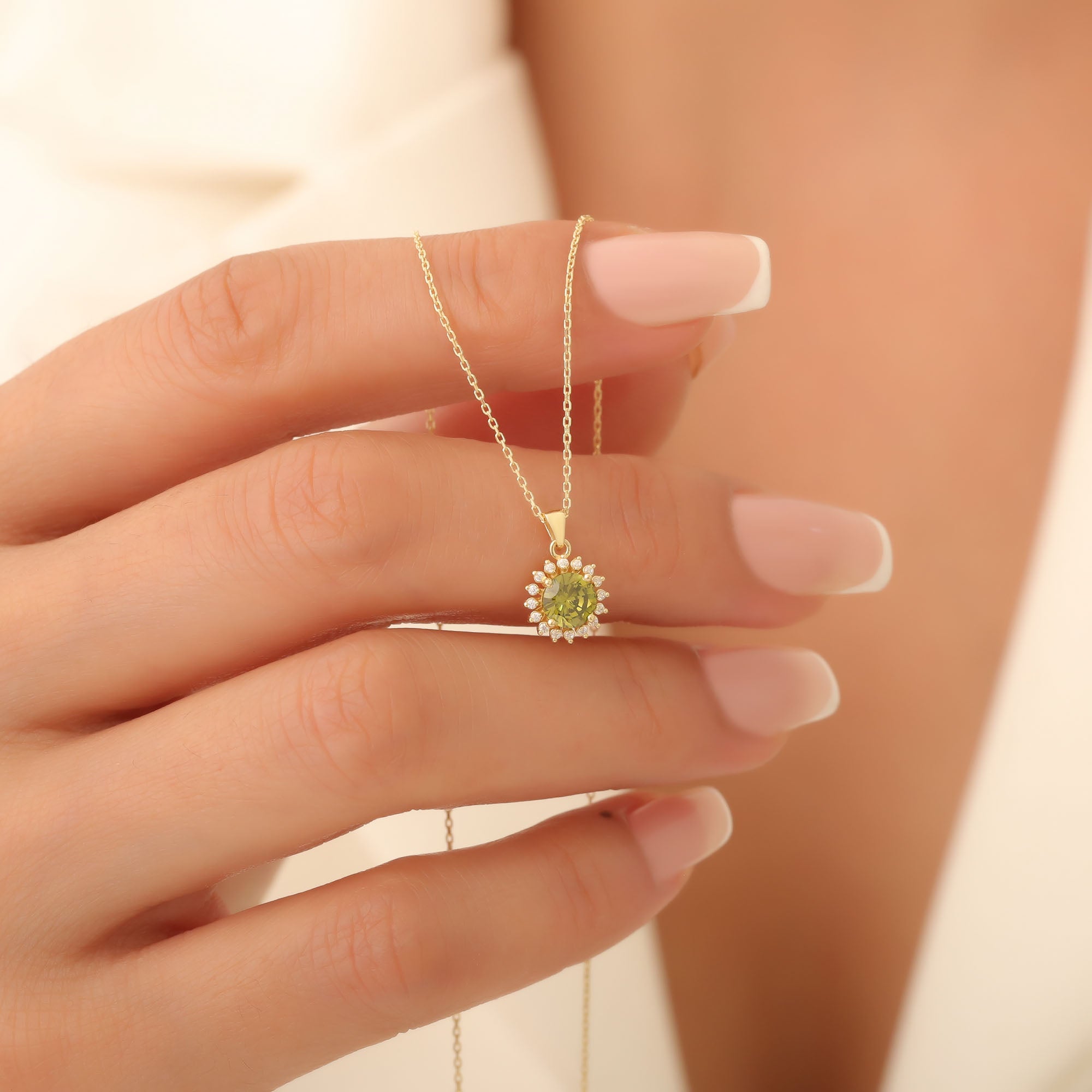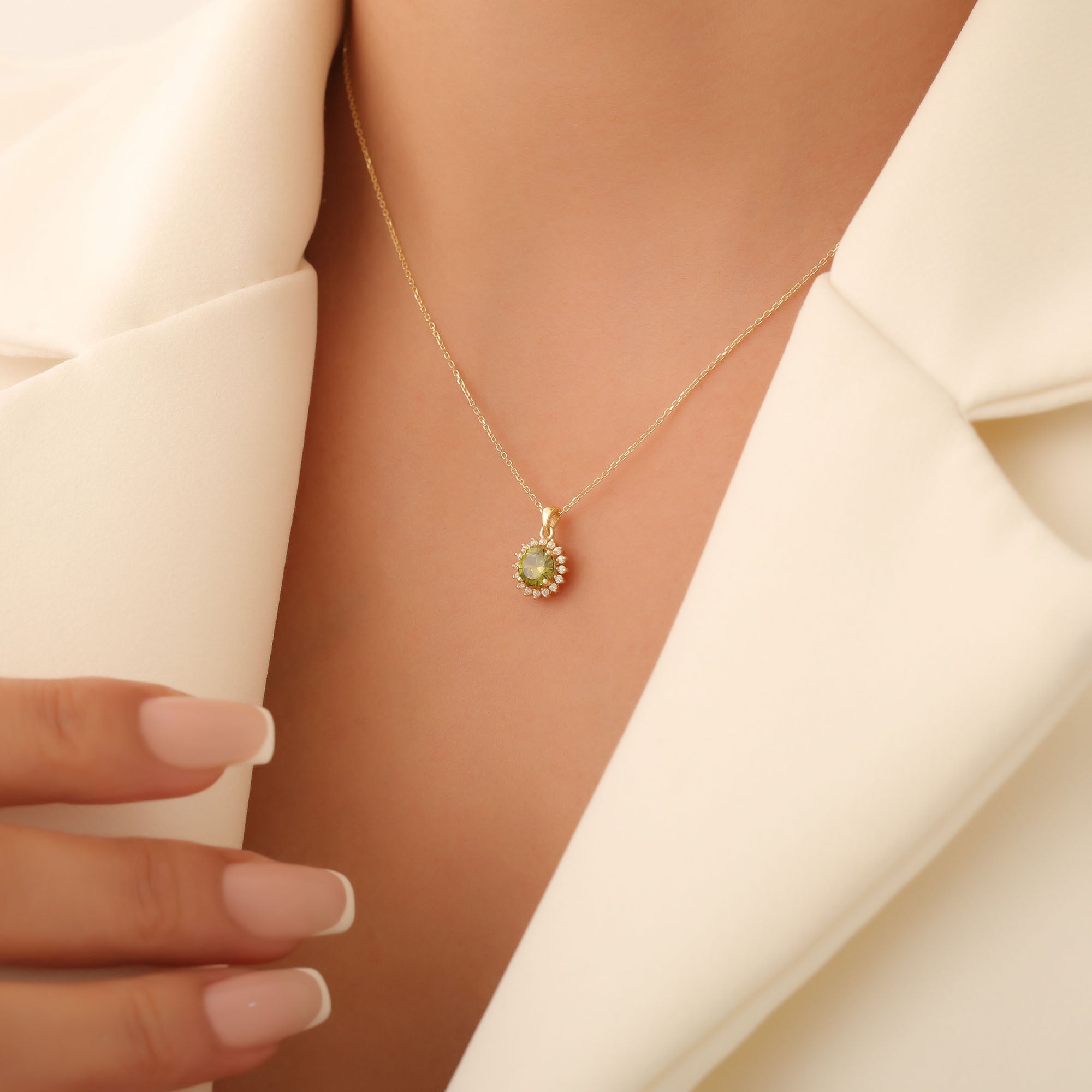 Elevate your style with our exquisite 14K Solid Gold Peridot Necklace, designed to reflect elegance and sophistication in every detail. The stunning round-shaped peridot is artfully set within a glimmering halo of real diamonds, striking the perfect balance between luxury and charm. This enchanting piece not only celebrates the beauty of the vibrant green peridot, known for its connection to renewal and growth, but it is also a meaningful gift for those born in August or for anyone who appreciates the captivating allure of gemstones.
