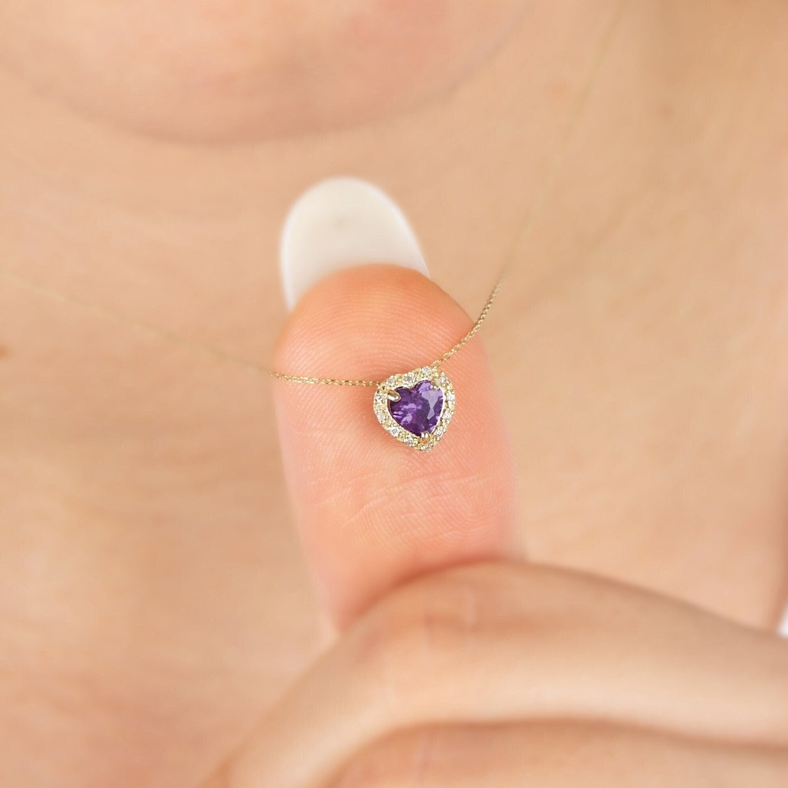 Amethyst Heart Necklace with Real Diamond, 14K Solid Gold, February Birthstone
