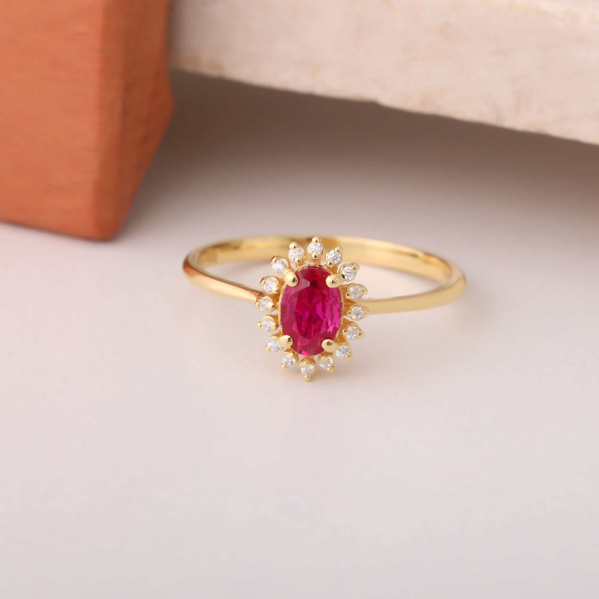 Ruby Oval Ring 14K Solid Gold Surrounded by Real Diamonds, July Birthstone Gift