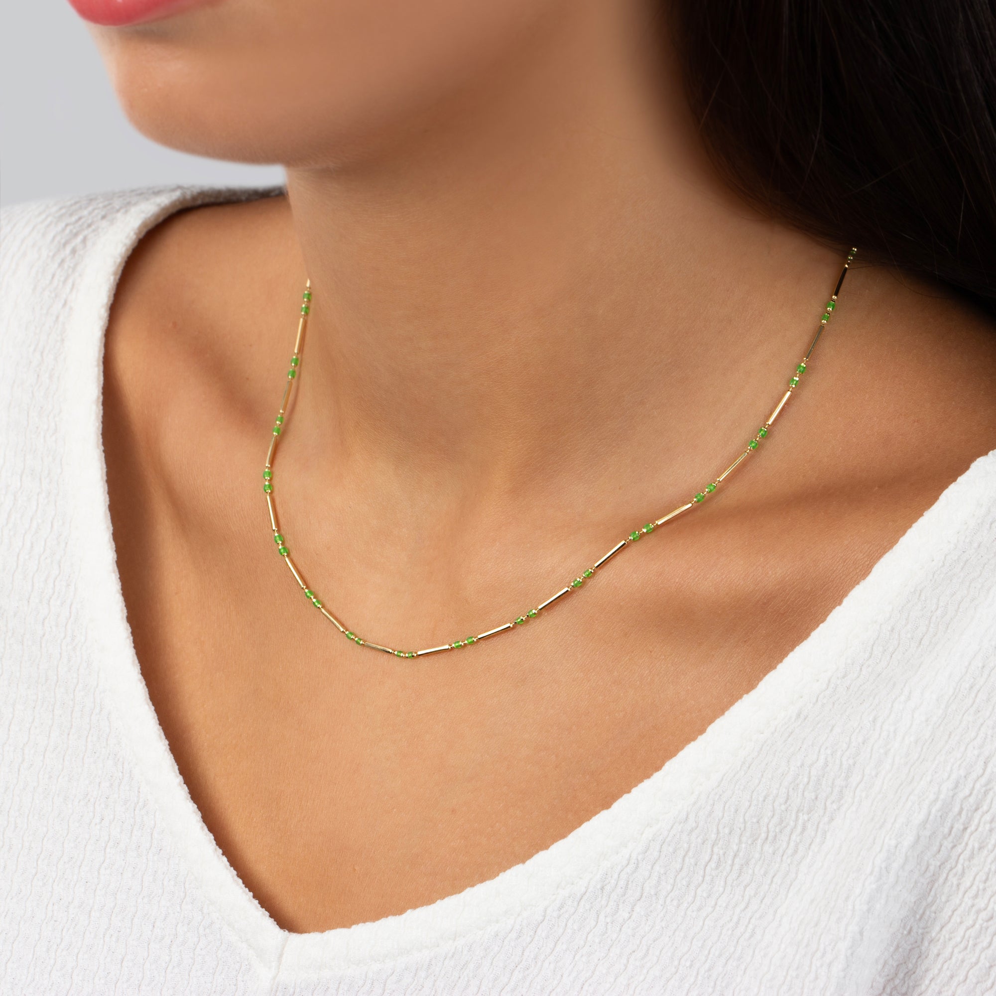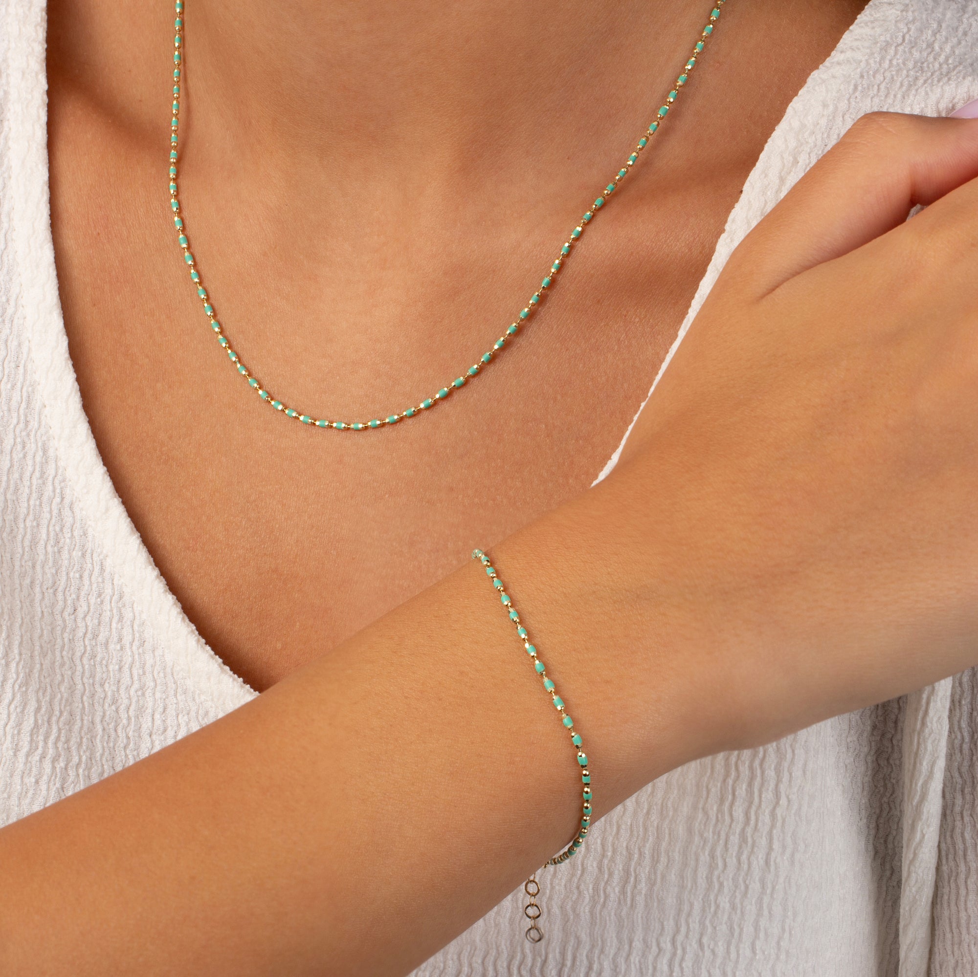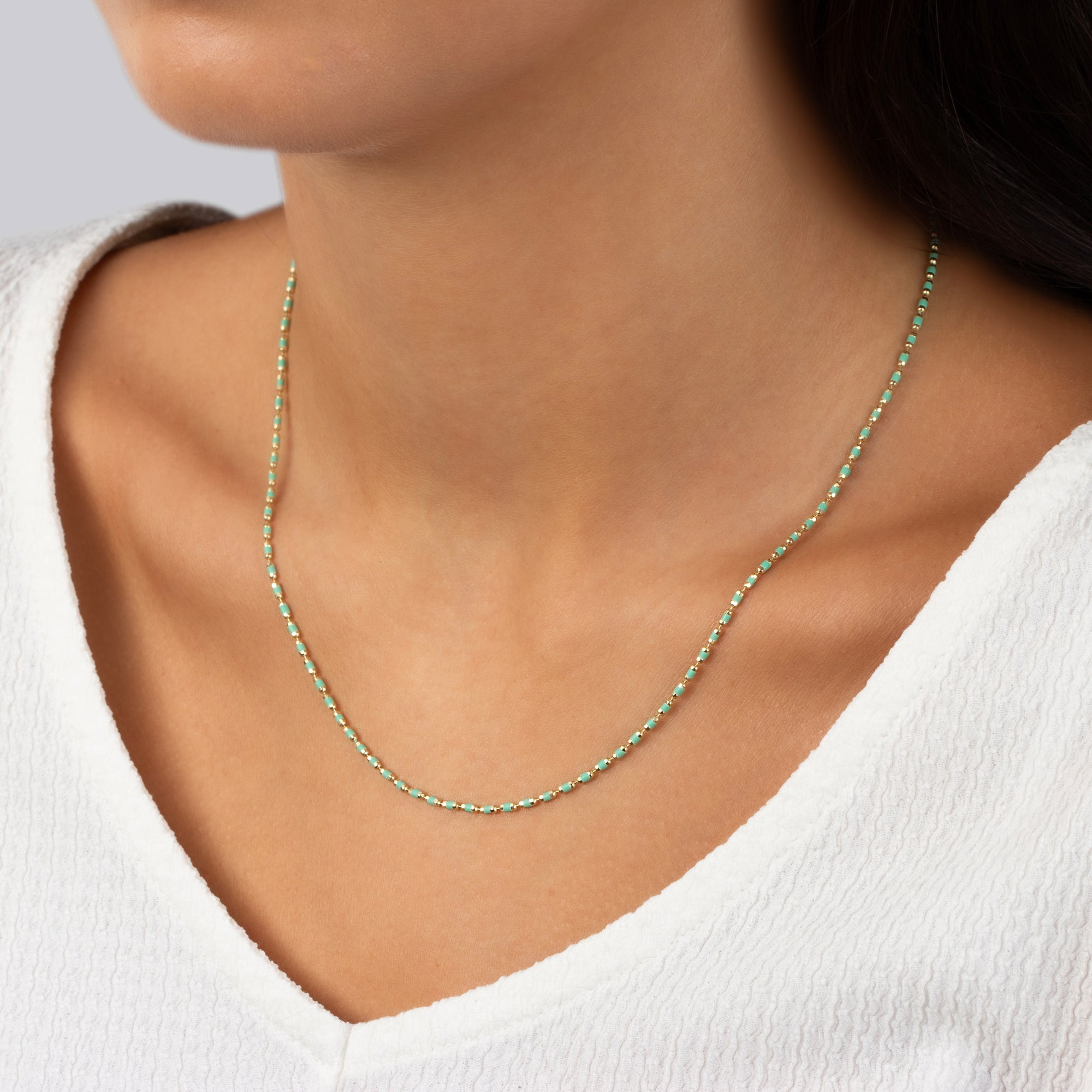 Emerald Enameled Beaded Necklace in 14K Solid Gold, Mini Italian Ball Chain