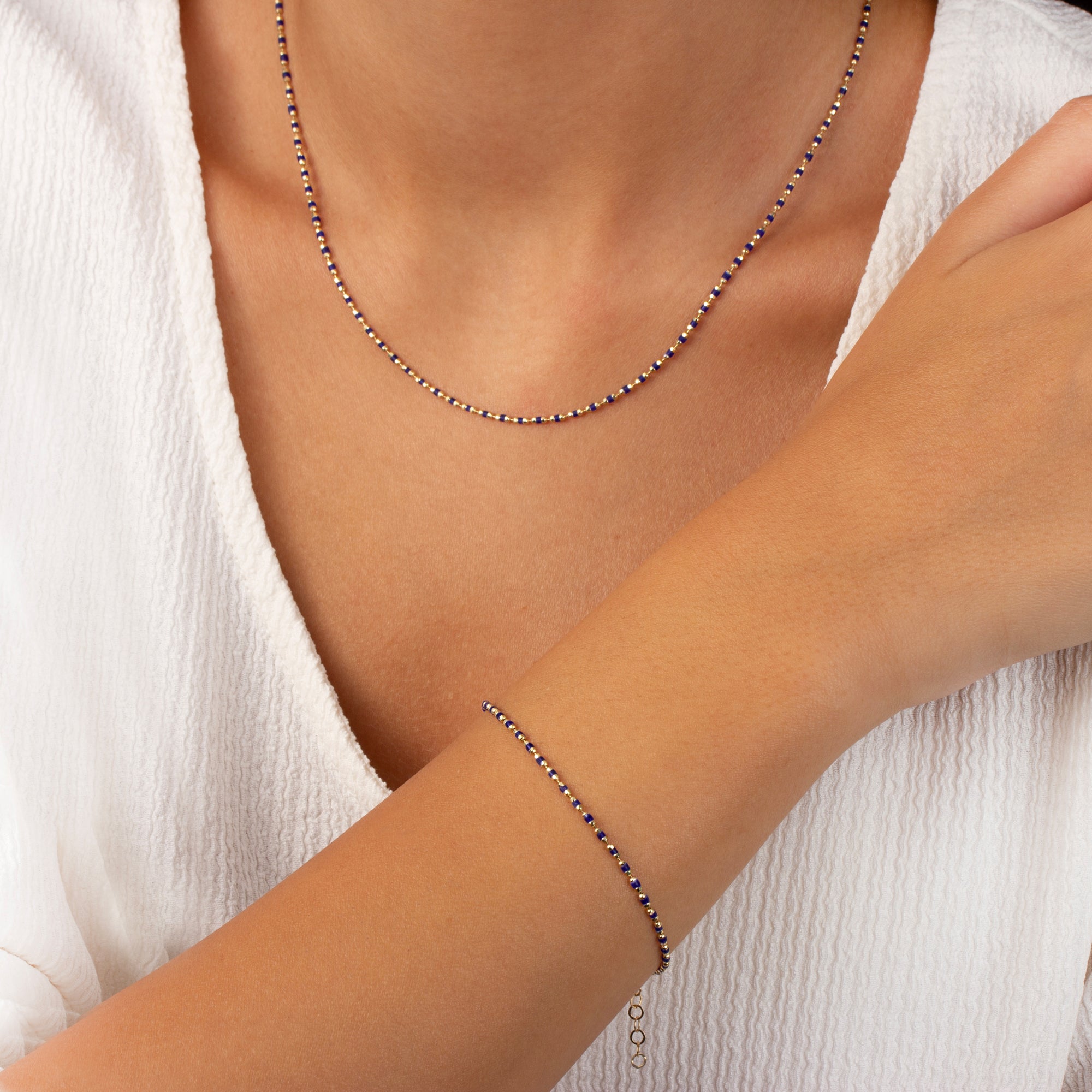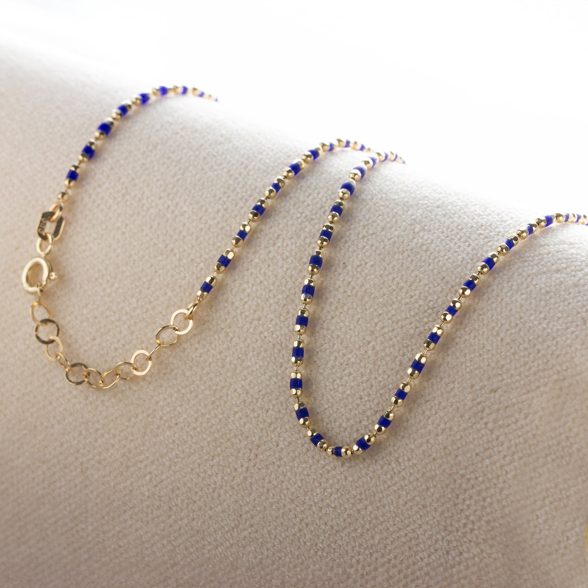 Sapphire Enameled Beaded Necklace in 14K Solid Gold, Mini Italian Ball Chain