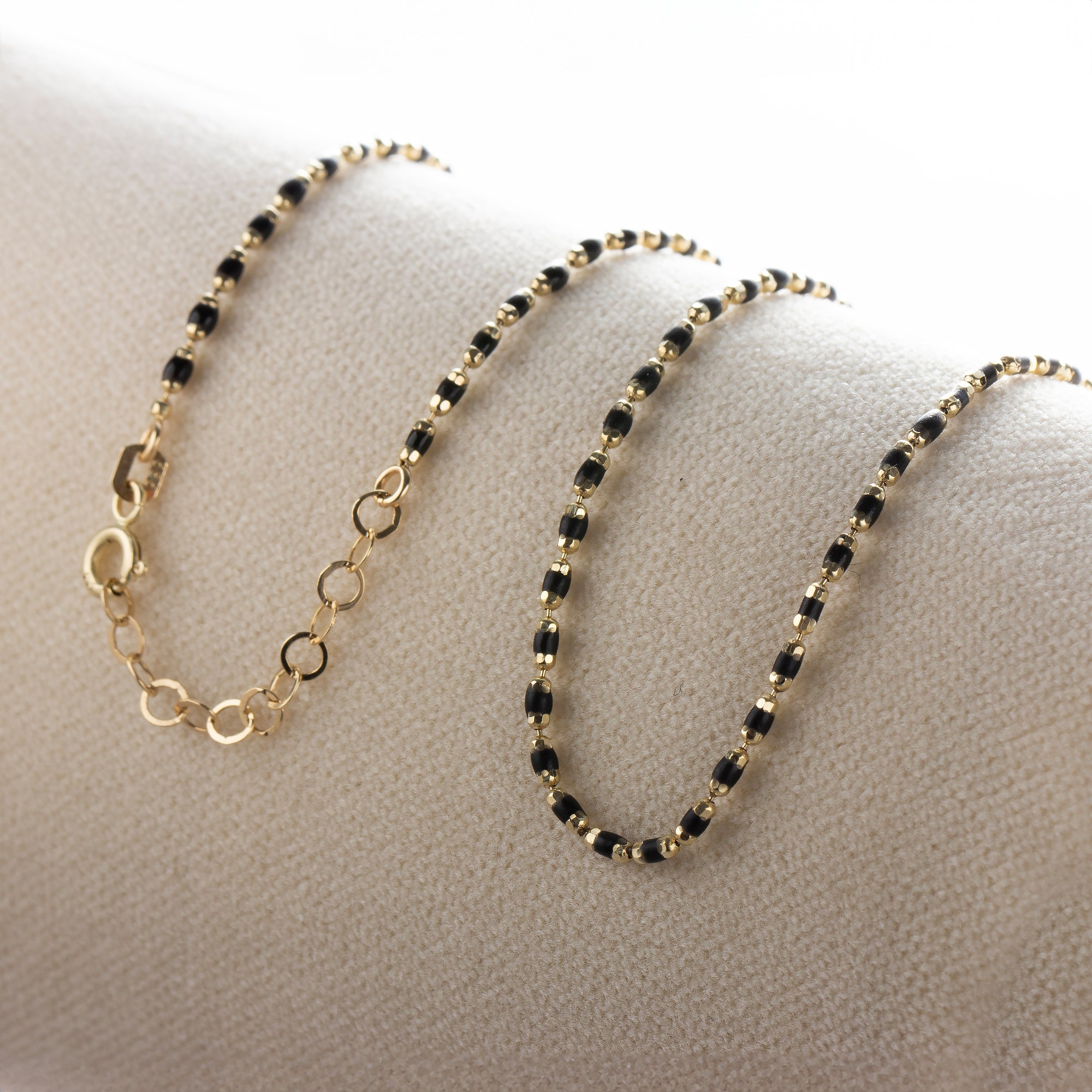 14K Solid Gold Black Onyx Necklace, Layered Enameled Spaced Beaded Bar Chain