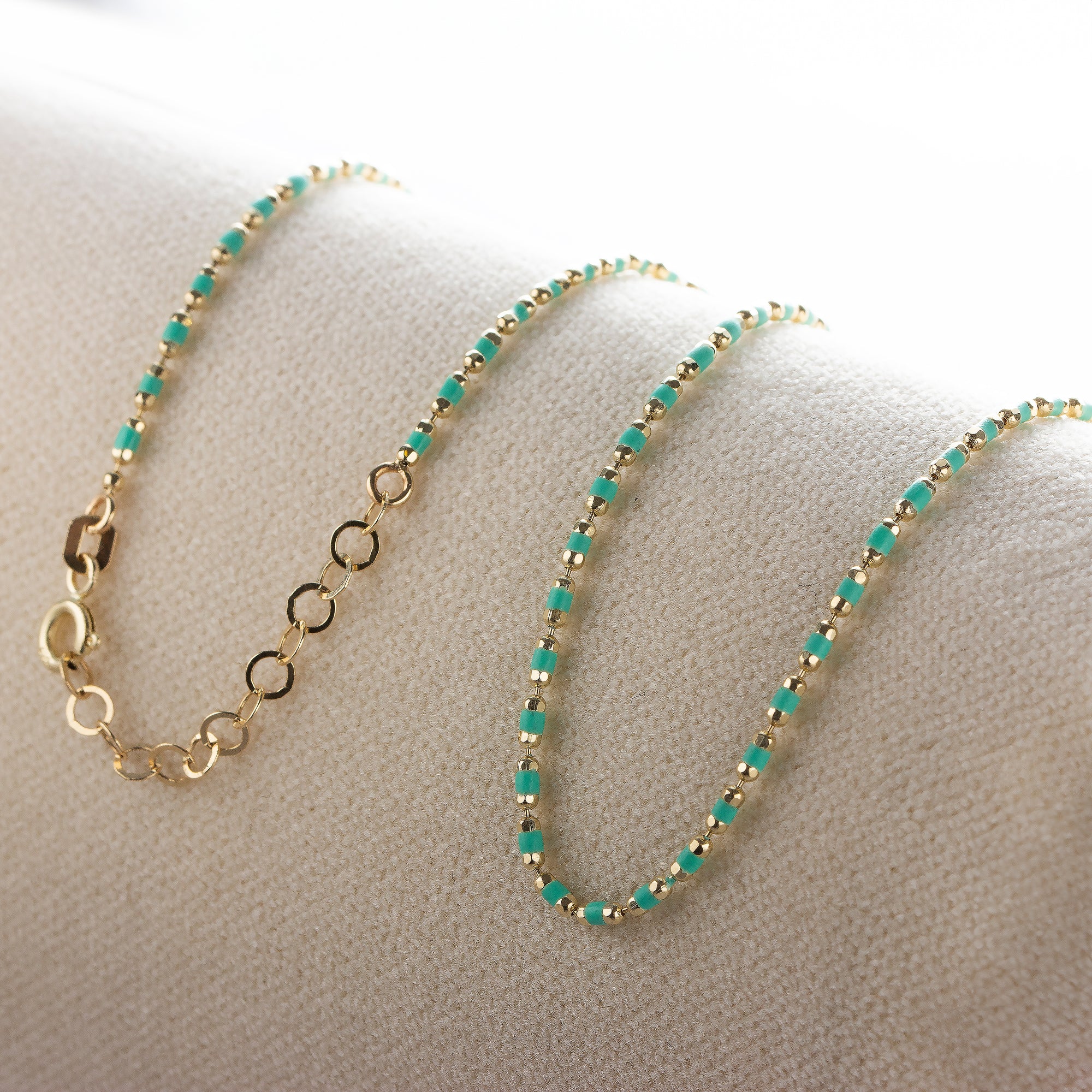 14K Solid Gold Aquagreen Necklace, Layered Enameled Spaced Beaded Bar Chain