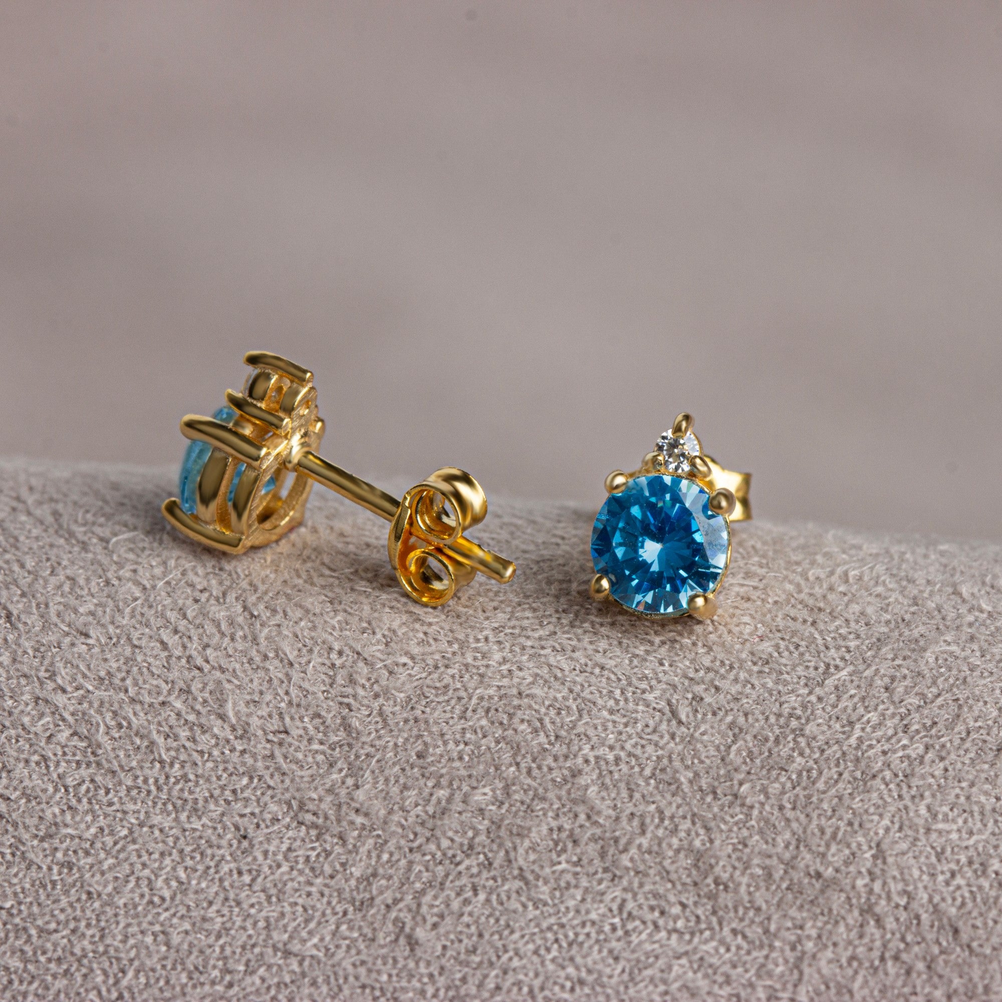 Round Blue Topaz Stud Earring in 14K Solid Gold with Single Stone Real Diamond, December Birthstone Jewelry