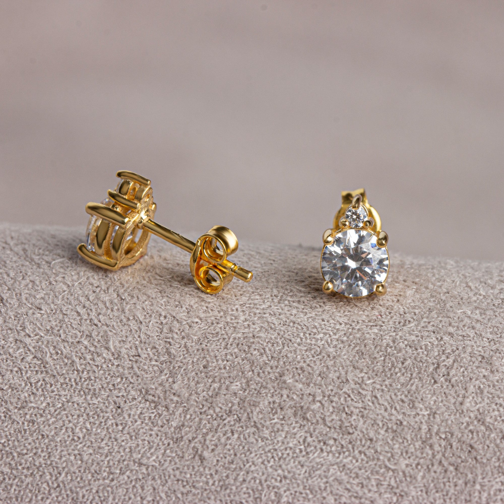 Round White Topaz Stud Earring in 14K Solid Gold with Single Stone Real Diamond, April Birthstone Jewelry