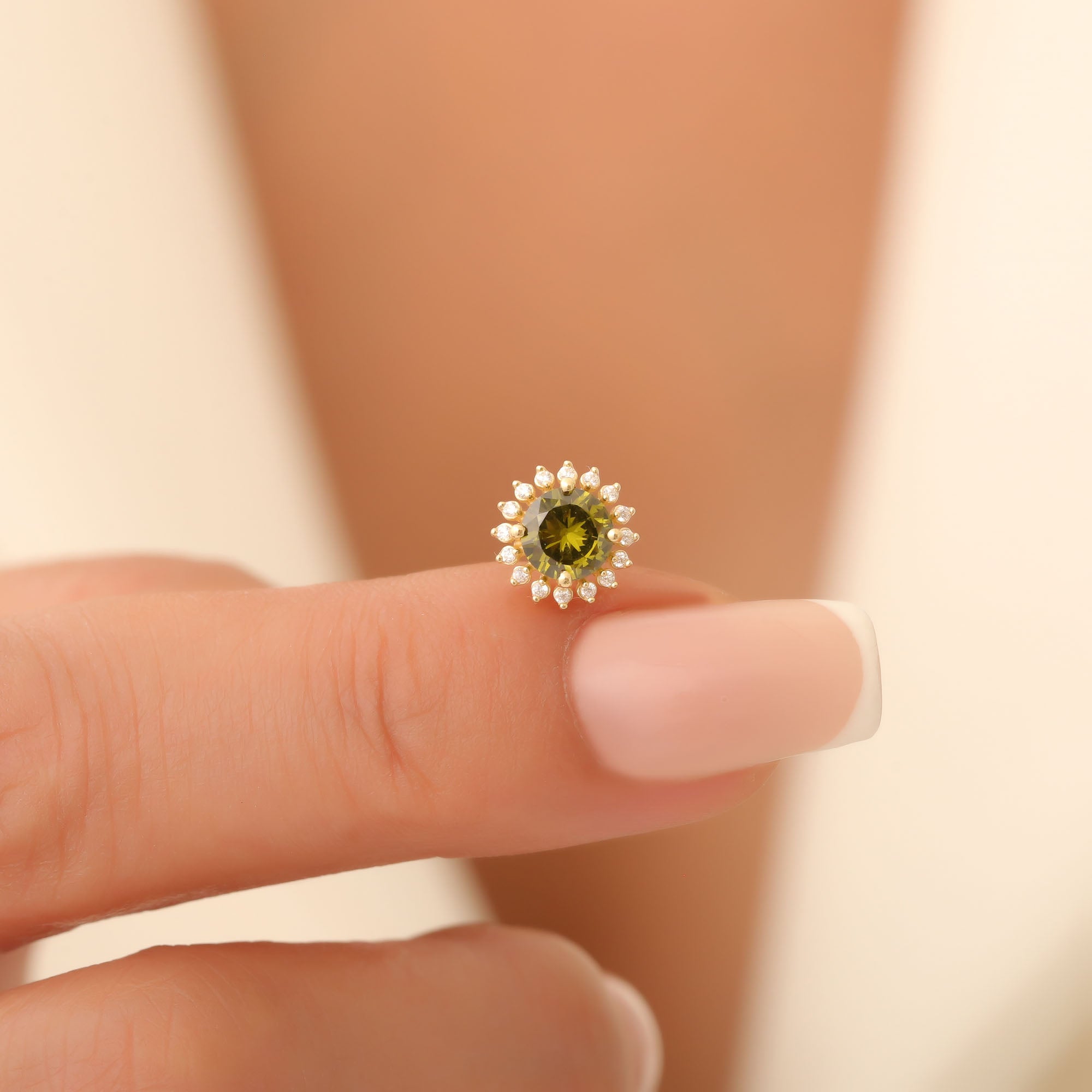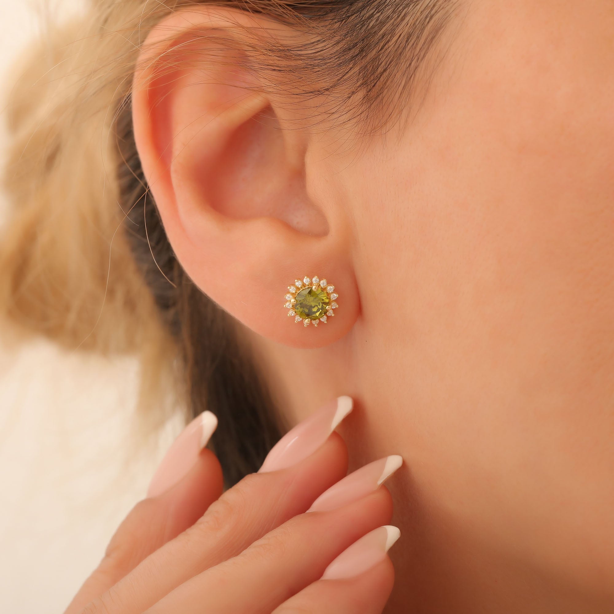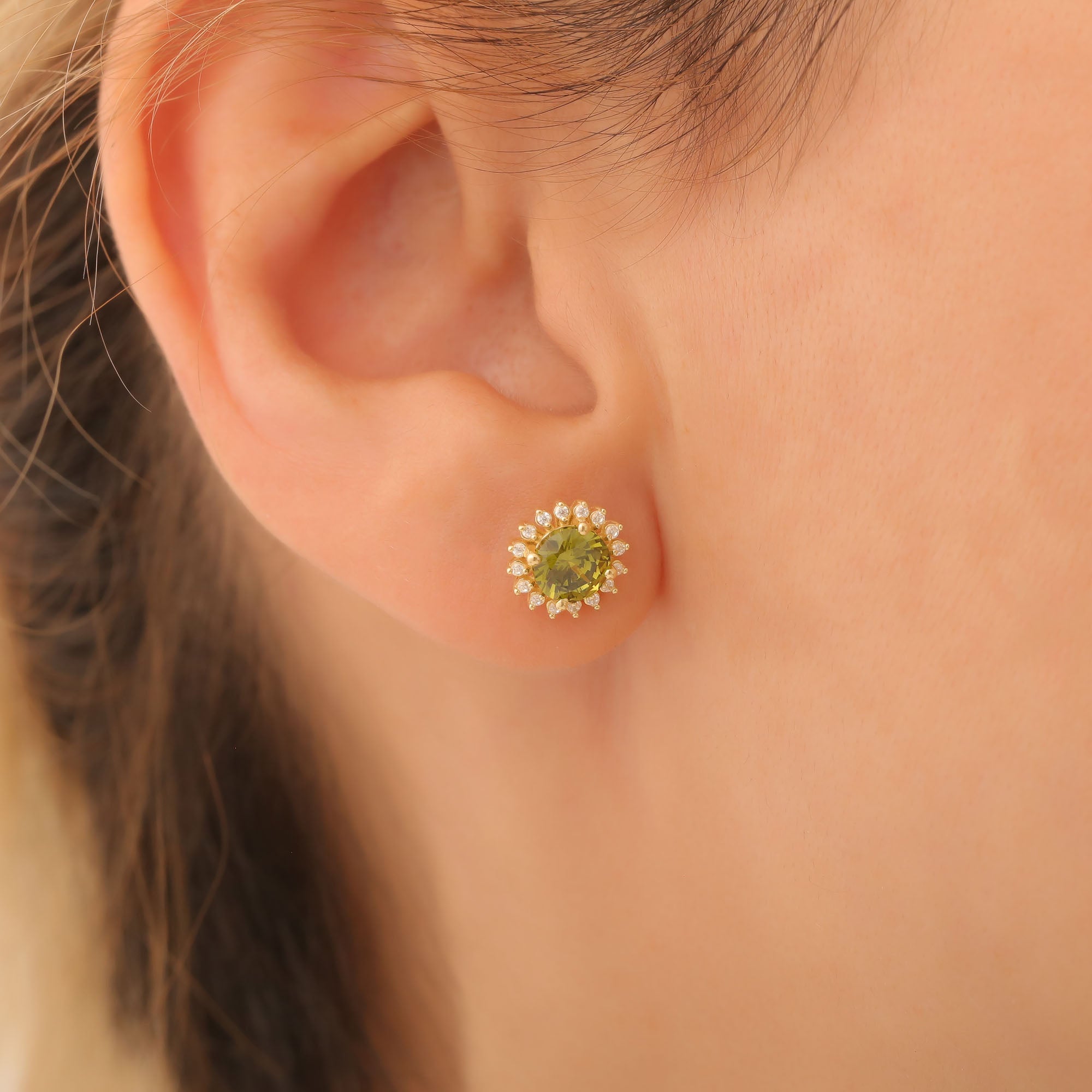 Elevate your jewelry collection with our stunning 14K Solid Gold Peridot Stud Earrings, a perfect blend of elegance and brilliance. These exquisite earrings feature radiant round-shaped peridot gemstones, the beautiful August birthstone, encapsulated in a halo of sparkling real diamonds. The vibrant green hue of the peridot not only symbolizes growth and renewal but also brings a splash of color to any outfit, making these earrings a versatile addition to both your casual and formal attire.