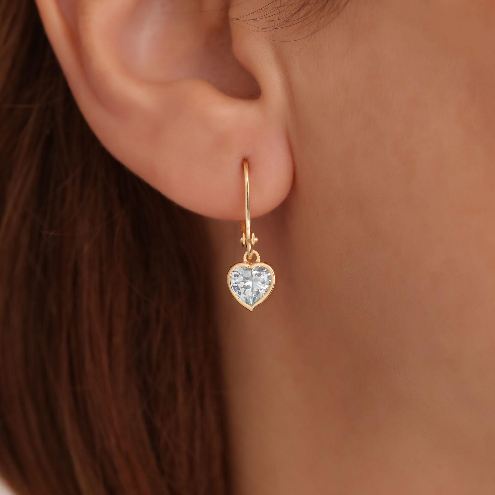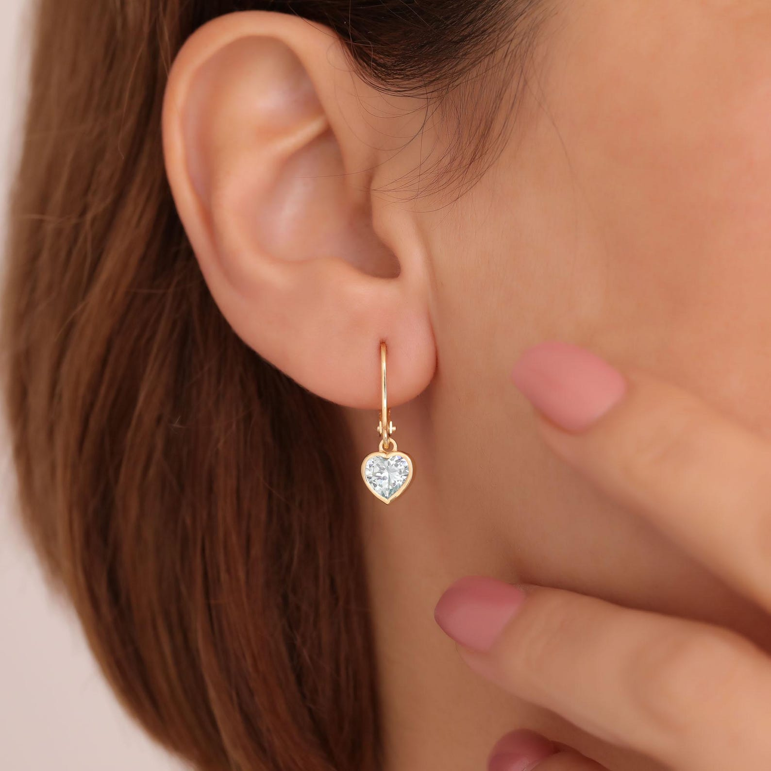 Aquamarine Heart Cut Bezel Dangle Earrings 14K Solid Gold, March Birthstone Jewelry