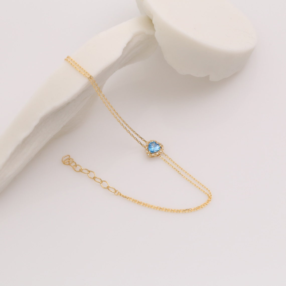 Blue Topaz Heart Bracelet with Real Diamond, 14K Solid Gold, December Birthstone