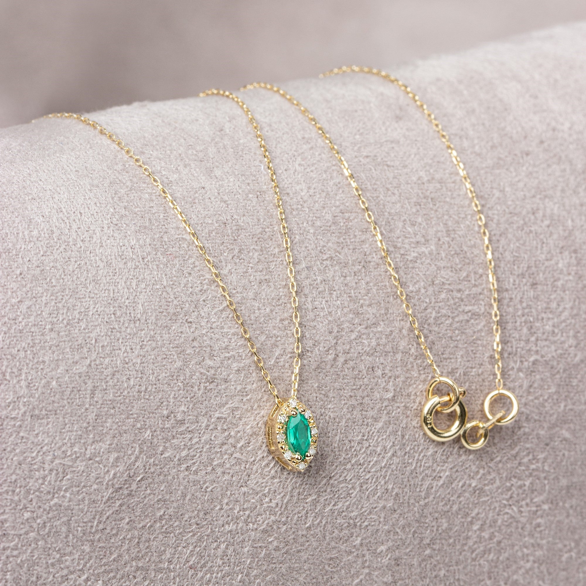 Emerald Marquise Cut Necklace in 14K Solid Gold with Real Diamonds, May Birthstone