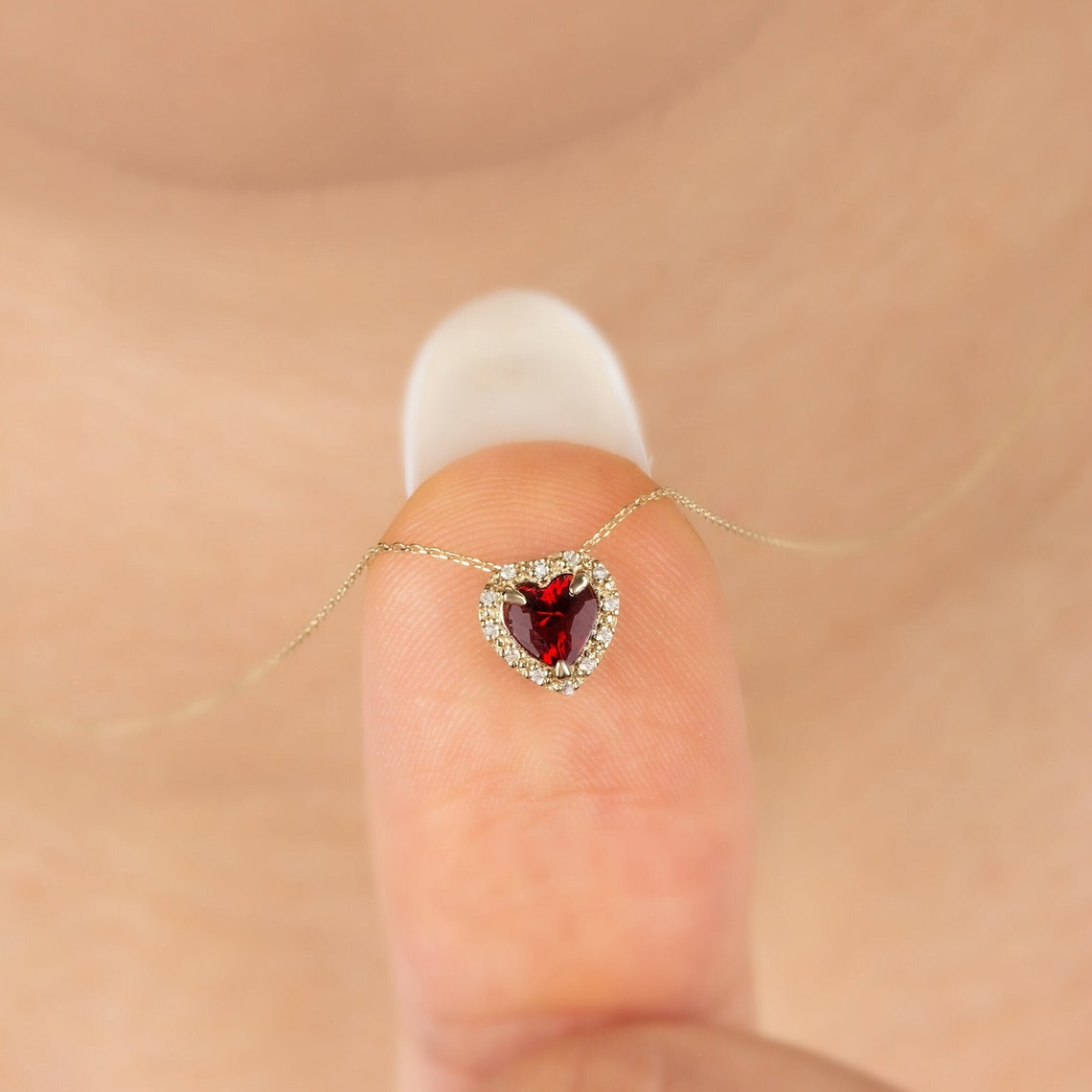 Garnet Heart Necklace with Real Diamond, 14K Solid Gold, January Birthstone