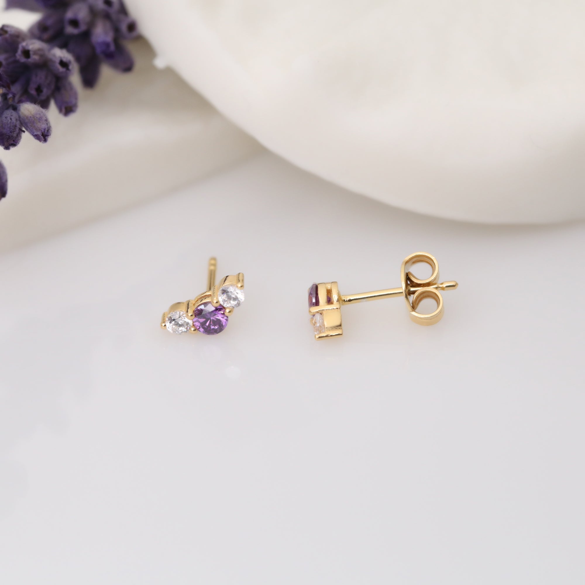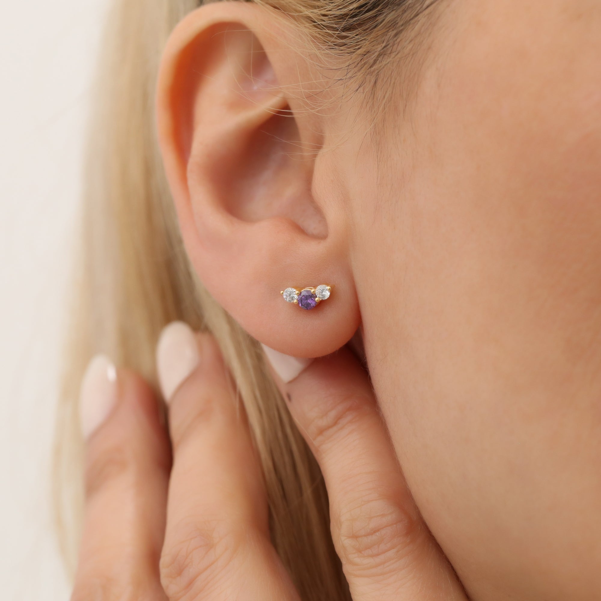 Discover the timeless elegance of our 14K Solid Gold Real Diamond 3-Stone Stud Earrings, meticulously handcrafted to perfection. These exquisite earrings feature a stunning amethyst, the birthstone for February, elegantly set in the center. Flanked by two radiant diamonds on either side, these studs offer a sophisticated sparkle that will elevate any outfit. Each piece is carefully crafted with 14K solid gold, ensuring lasting durability and a luxurious finish. Measuring just the right size for a comfortable yet noticeable statement, these studs are perfect for both everyday wear and special occasions.