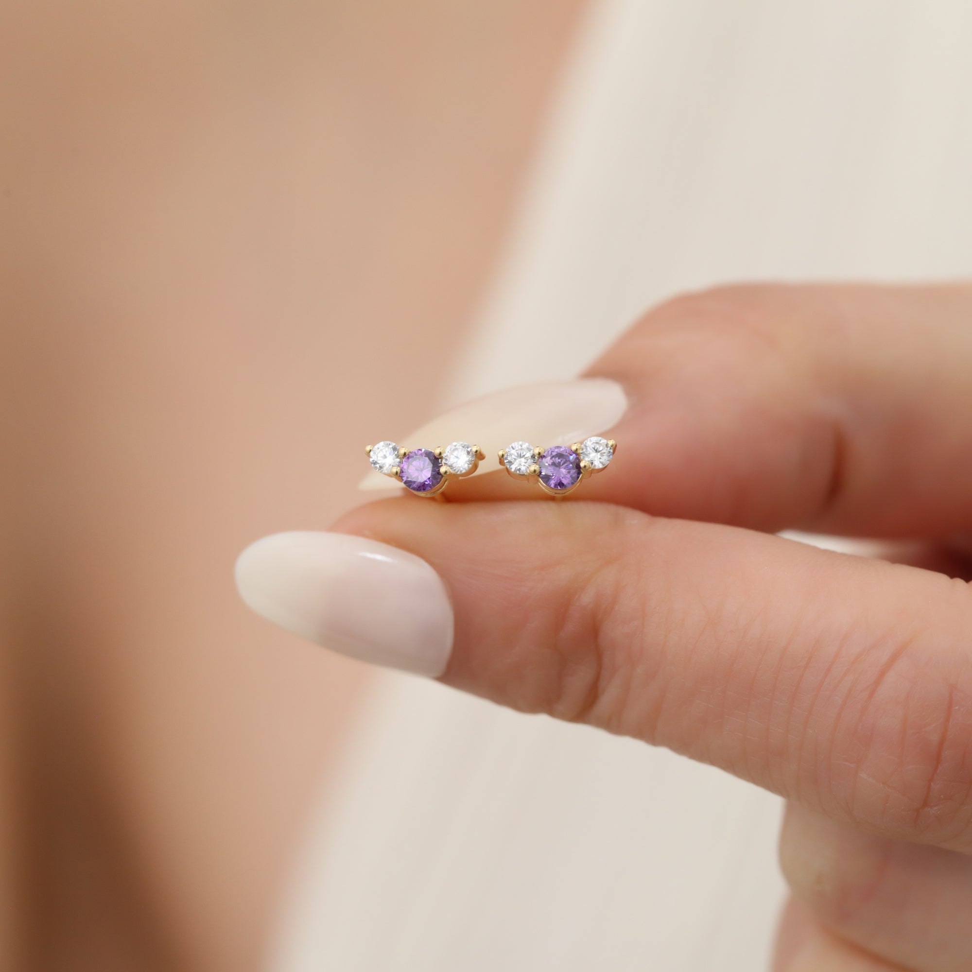 These 14K solid gold and real diamond 3-stone stud earrings are designed with precision and care, making them not only a stylish accessory but also a meaningful keepsake. The amethyst gemstone is renowned for its calming energy and its association with clarity and wisdom, making these earrings a thoughtful gift for anyone celebrating a February birthday or simply appreciating the beauty of this precious stone. purple hue of the amethyst pairs beautifully with the brilliant sparkle of the diamonds, creating a harmonious and enchanting look.
