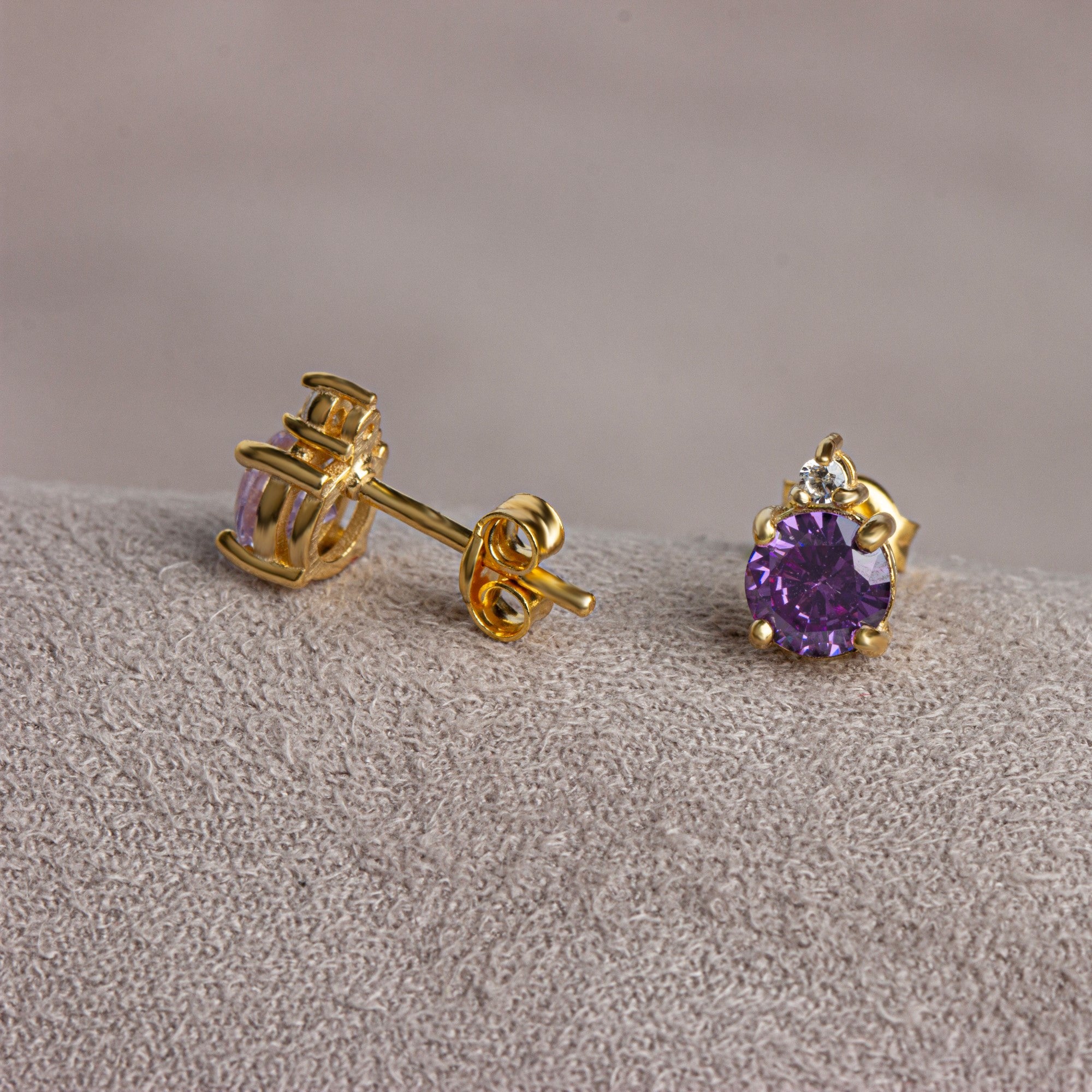 Round Amethyst Stud Earring in 14K Solid Gold with Single Stone Real Diamond, February Birthstone Jewelry