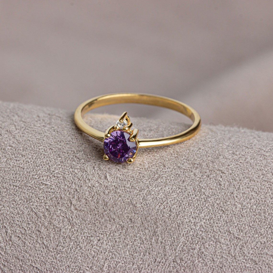 Round Amethyst Ring in 14K Solid Gold with Single Stone Real Diamond, February Birthstone Jewelry