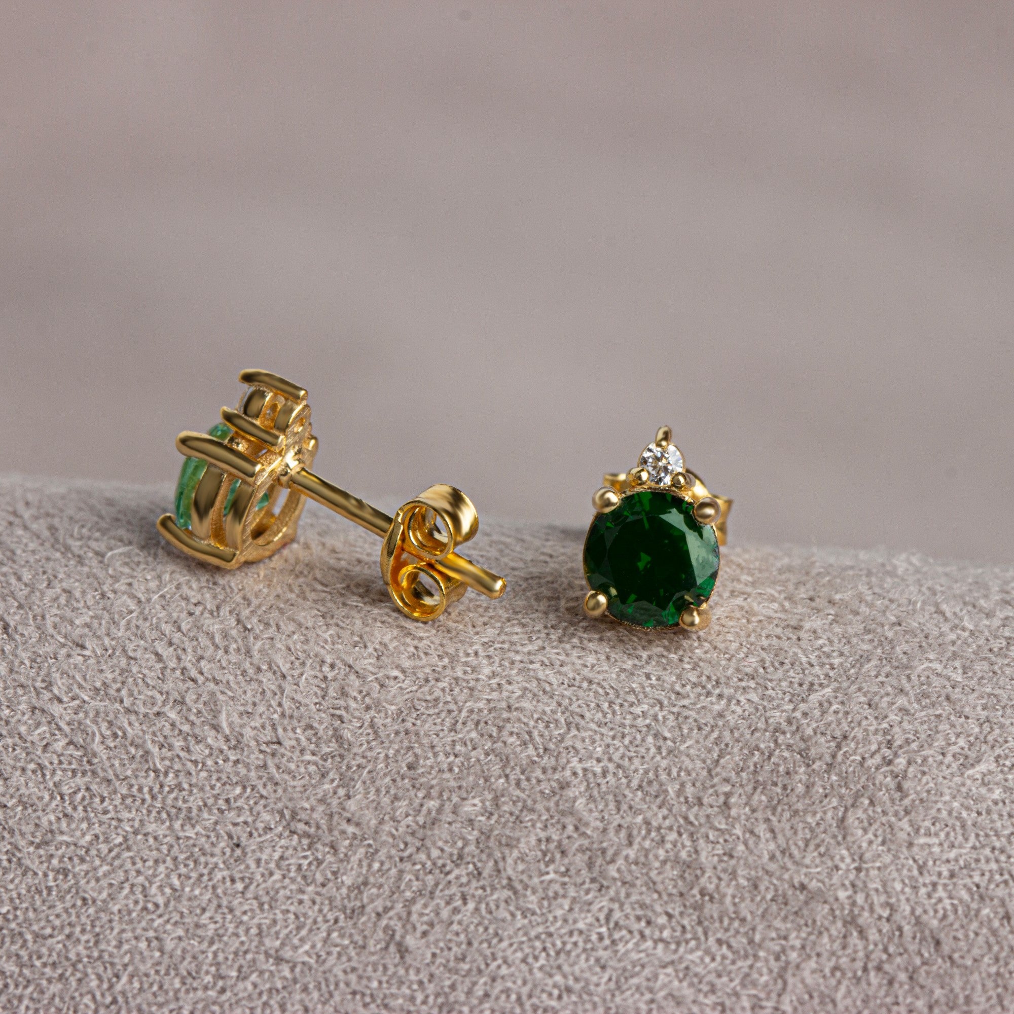 Round Emerald Stud Earring in 14K Solid Gold with Single Stone Real Diamond, May Birthstone Jewelry