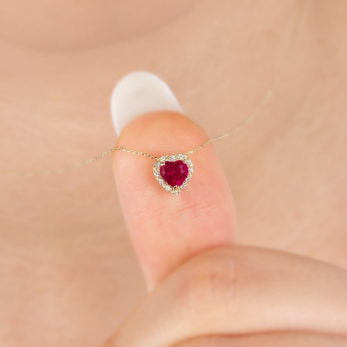 Ruby Heart Necklace with Real Diamond, 14K Solid Gold, July Birthstone