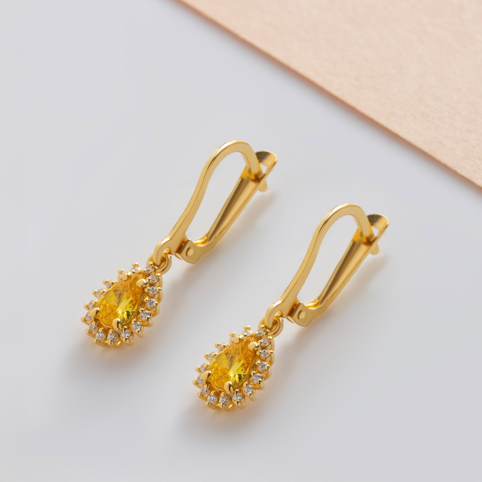 Teardrop Yellow Topaz Bezel Dangling Earrings in 8K/10K/14K Solid Gold Surrounded with Real Diamonds, November Birthstone Jewelry