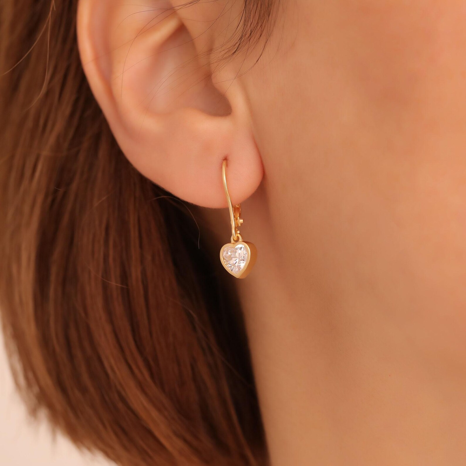 White Topaz Heart Cut Bezel Dangle Earrings, 14K Solid Gold April Birthstone Jewelry